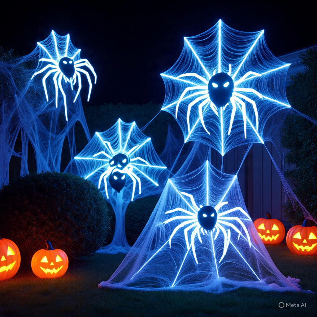Cover bushes, trees, or hedges with giant faux spider webs. Add oversized spiders that glow in the dark to really creep out visitors.