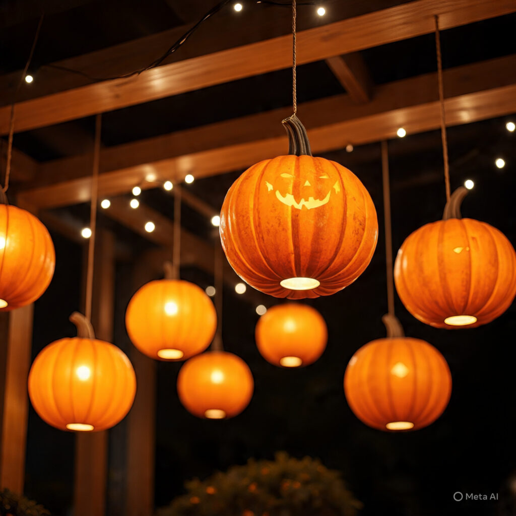 Instead of placing pumpkins on the ground, hang them upside-down with string lights inside. This creates a unique and modern Halloween look.