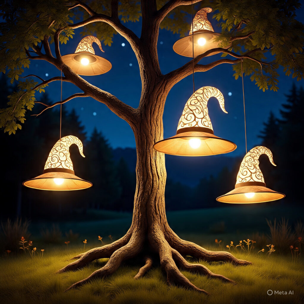 Hang glowing witch hats from branches using fishing line and battery-operated lights. They look like they’re floating mid-air at night.