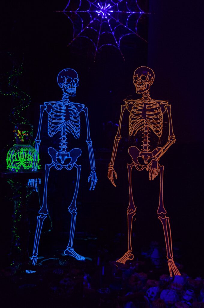Glow-in-the-dark skeletons, neon spider webs, and glowing cocktails are all the rage. UV lights and neon makeup let guests shine as brightly as your eerie décor.