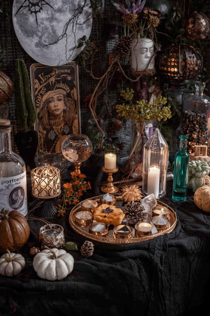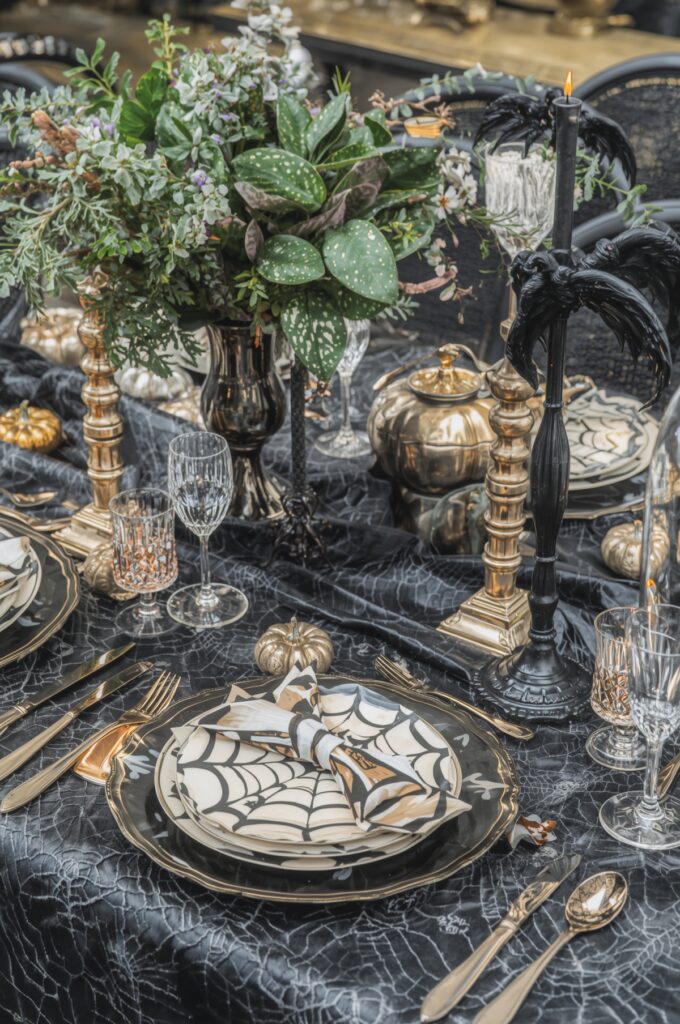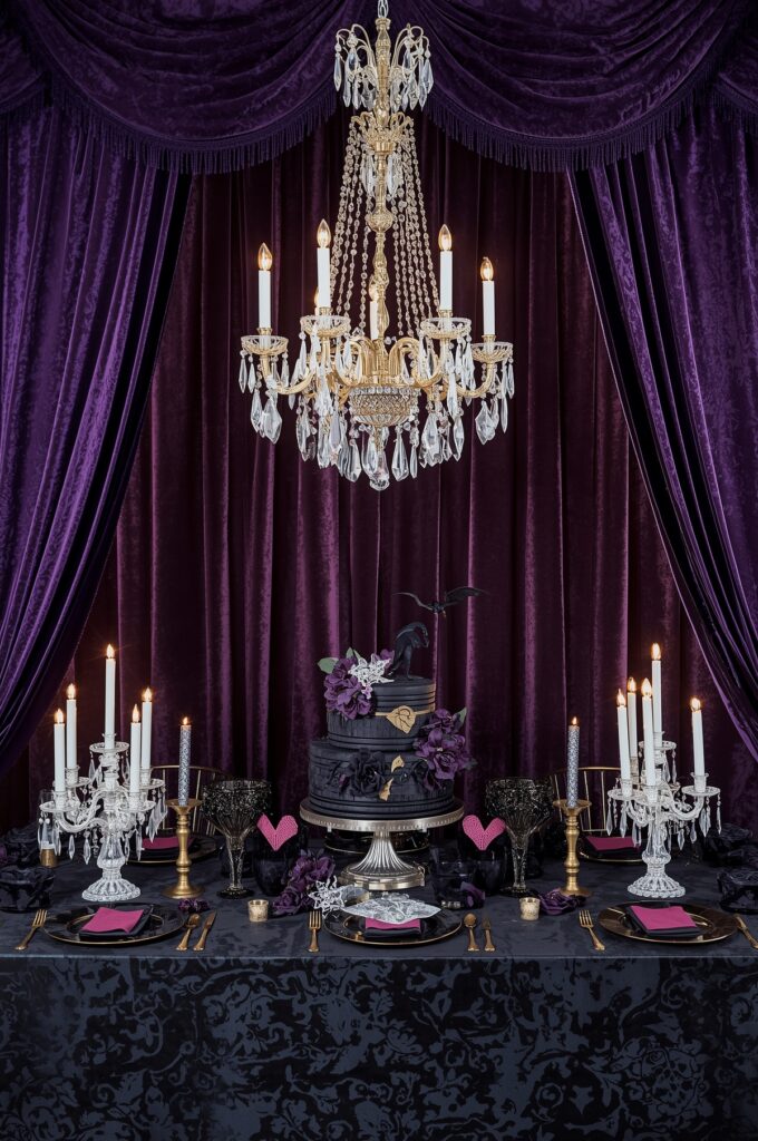 Think velvet drapes, crystal chandeliers, candelabras, and dark roses. Gothic luxury is perfect for hosts who want spooky elegance over jump scares.