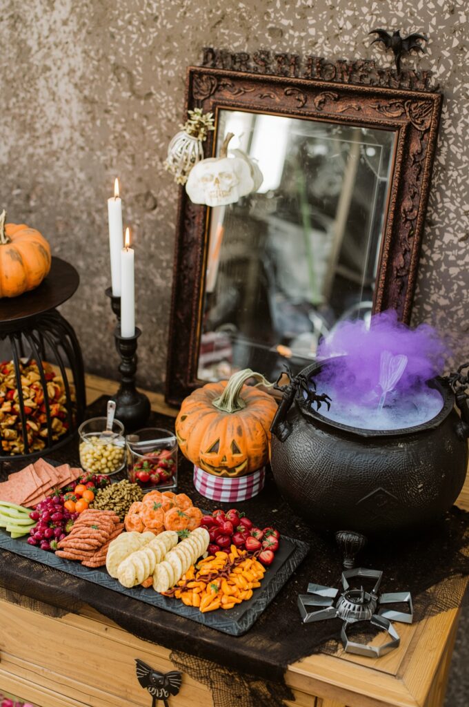 Forget basic candy bowls. Creepy charcuterie boards, glow-in-the-dark cotton candy, and bubbling cauldron punch bowls will make food part of the décor.