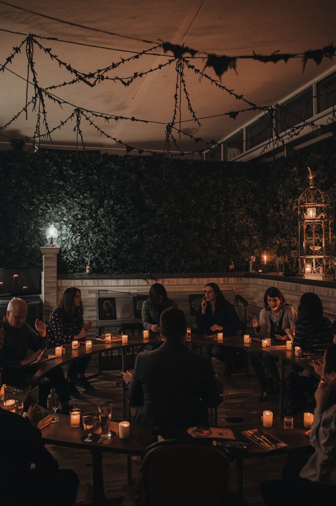 Guests sit in candlelit circles while hosts or apps generate interactive ghost stories, with guests deciding how the story unfolds. A spooky twist on storytelling.