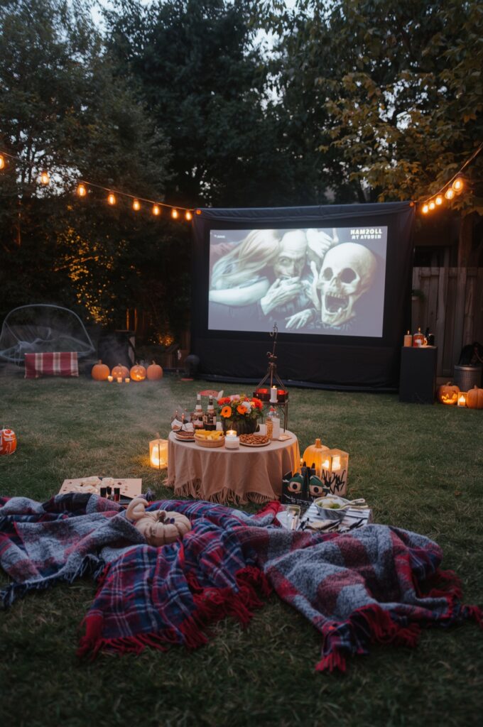 Project classic horror films on a big screen in the backyard. Add blankets, eerie fog machines, and themed snacks for a cozy-meets-creepy outdoor experience.