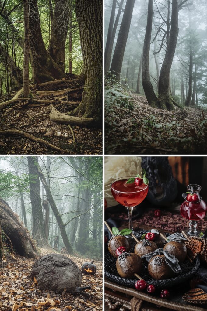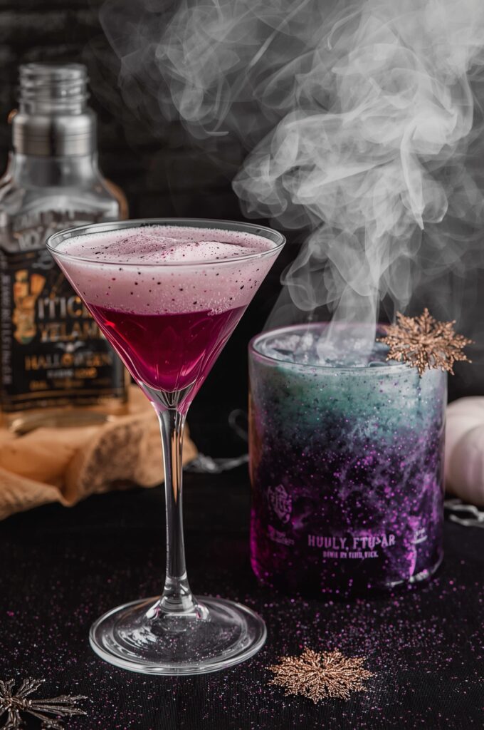 Cocktails look like they’re straight out of a witch’s cauldron. Dry ice, color-changing liquids, and edible glitter give drinks a magical (and eerie) vibe.