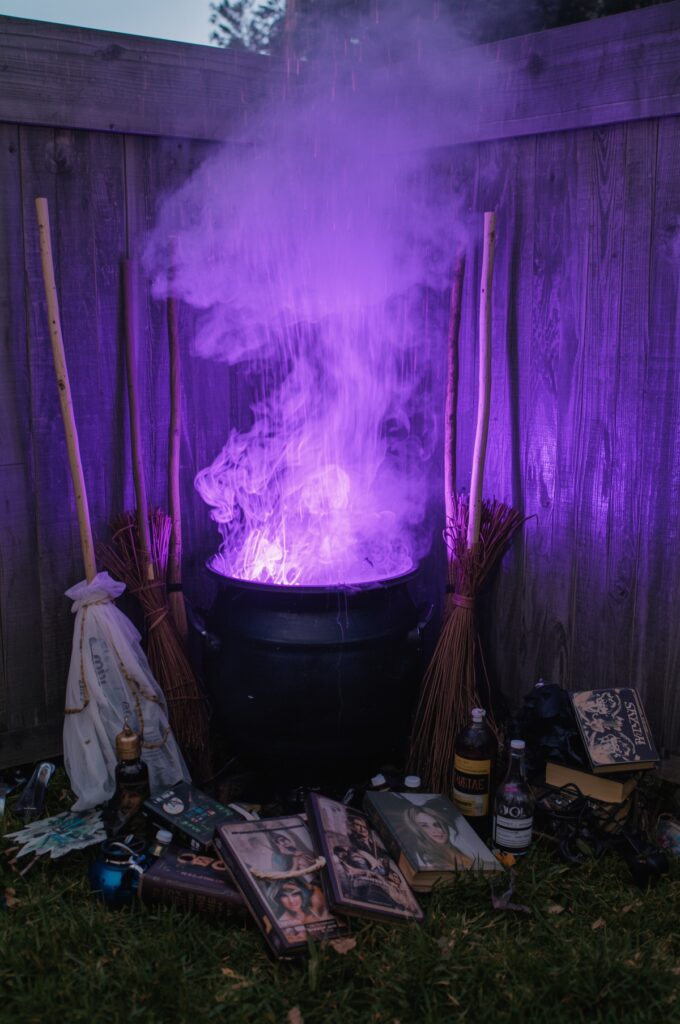 Set up a bubbling cauldron surrounded by broomsticks, spell books, and potion bottles. Add a smoke effect and purple lighting to make it look like witches are cooking up trouble.