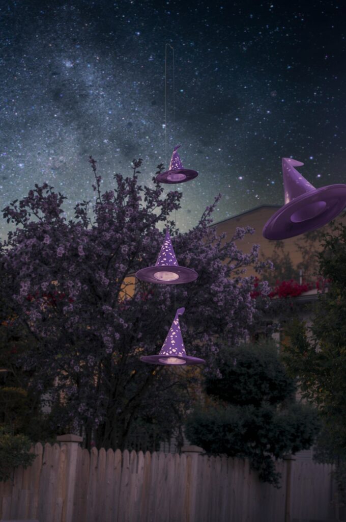 Hang glowing witch hats from invisible fishing lines on your porch or trees. They appear to float midair—an easy DIY trend that’s gone viral every Halloween season.
