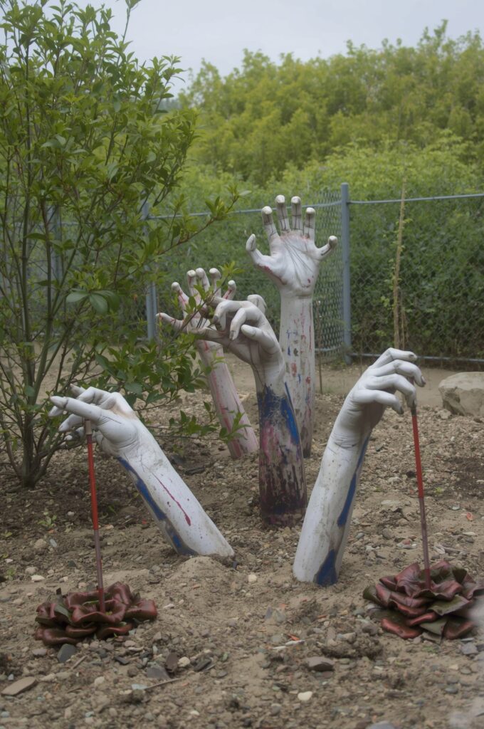 Stick fake zombie hands or arms rising from the soil. They create a thrilling visual effect that makes it look like the dead are clawing their way out of the ground.