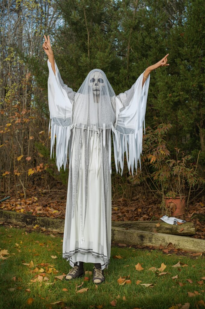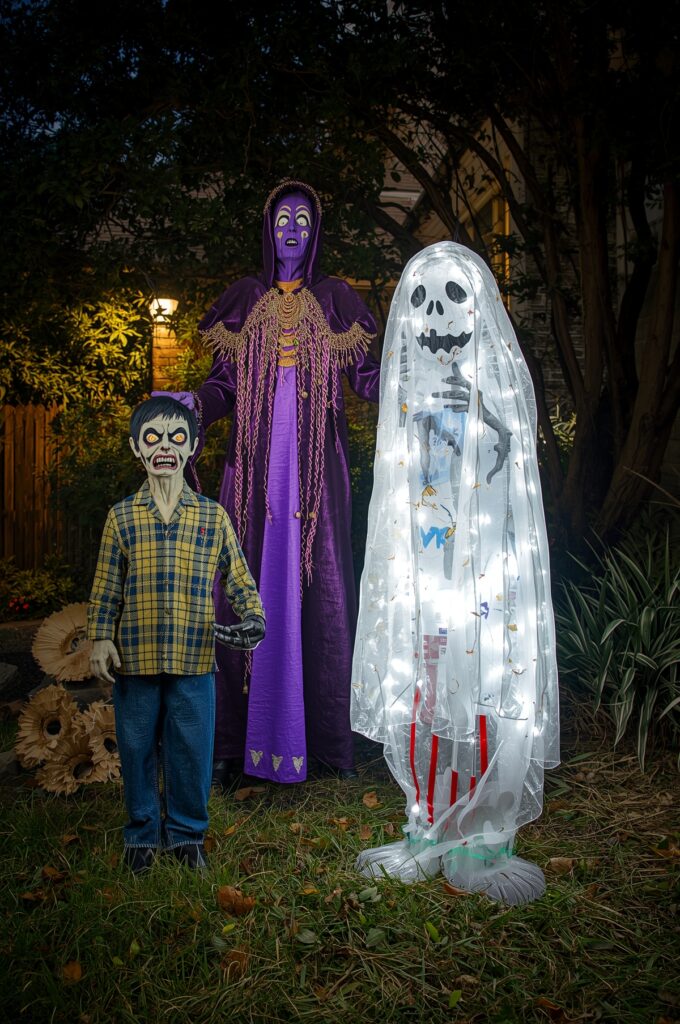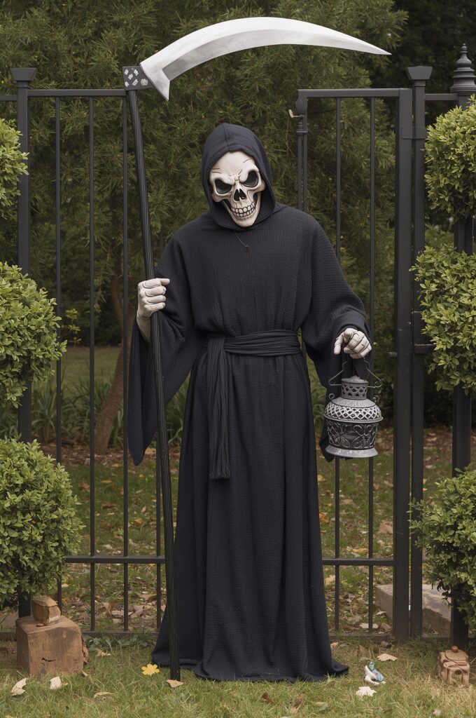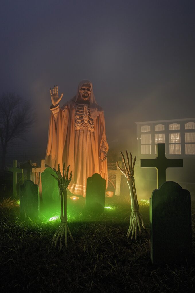 Place a life-size Grim Reaper figure at your entrance, holding a lantern or scythe. It instantly sets the mood for guests arriving at your haunted yard.