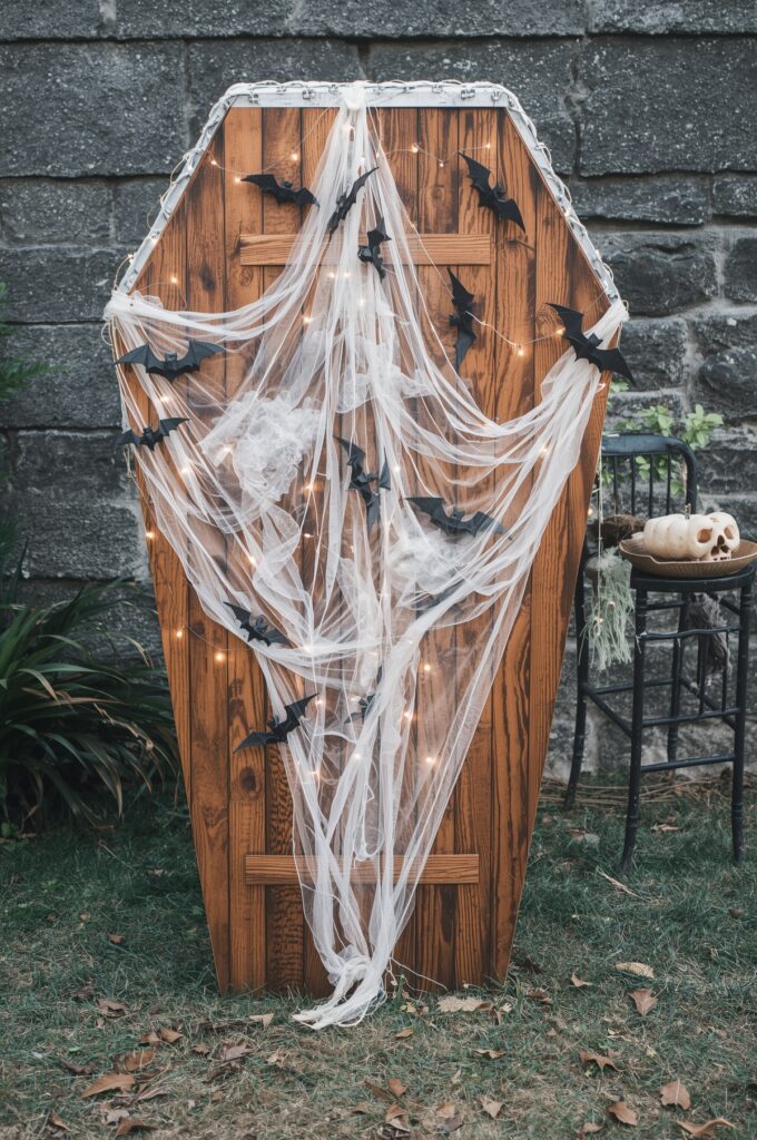Add a fun interactive element by setting up a wooden coffin prop where guests can take photos. Decorate it with cobwebs, bats, and eerie lighting for the perfect spooky selfie spot.