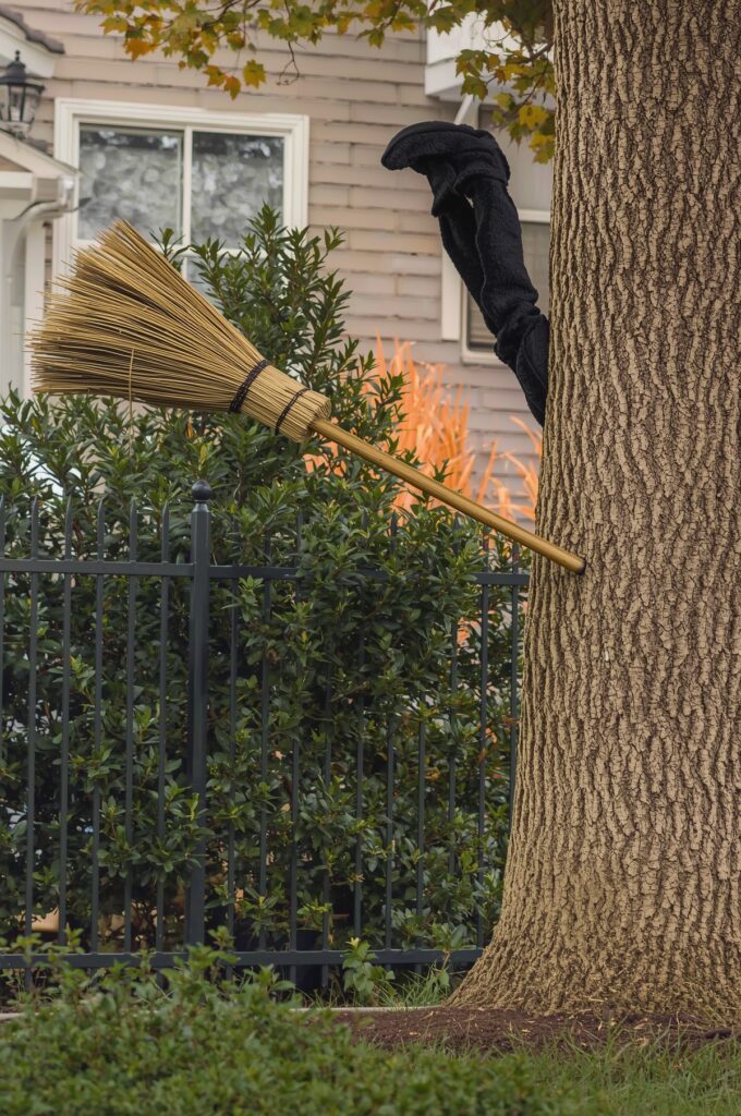 Create a hilarious scene with a broom and witch’s legs sticking out from a tree, fence, or bush. It’s a classic humorous Halloween touch that never gets old.