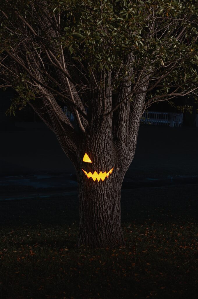 Attach glow-in-the-dark or LED tree face kits to trunks and branches to give your trees personality—and a creepy one at that! The glowing eyes peeking from the shadows add a spooky twist.