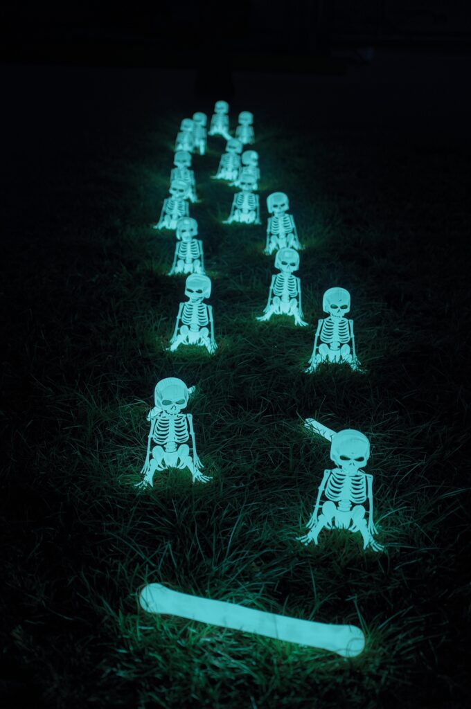 Lay out glow-in-the-dark skeletons or bones along your driveway or path. When the sun sets, they’ll radiate a ghostly light that guides guests to your door.
