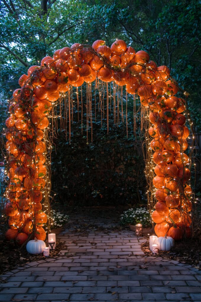 Build a festive arch made entirely of faux pumpkins, vines, and twinkling lights. It creates a welcoming (and Instagram-worthy) entry point for visitors and trick-or-treaters.