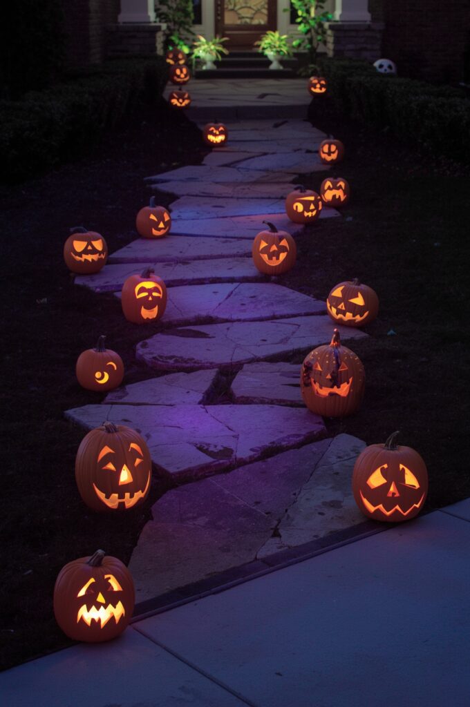 Line your walkway with carved pumpkins featuring creative faces or patterns. Use color-changing LED lights inside for a vibrant, glowing effect that makes your entryway irresistibly spooky.