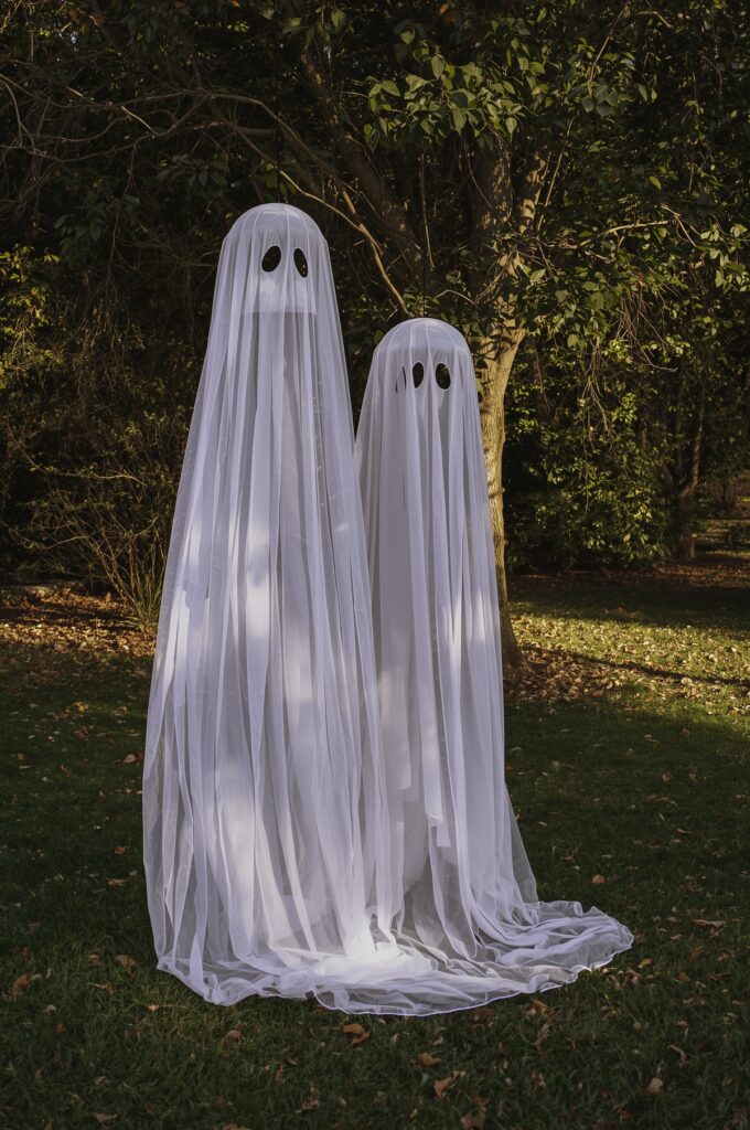 Drape translucent fabrics or white sheets from trees to create floating ghosts. The gentle breeze will make them sway eerily at night—simple, affordable, and highly effective.