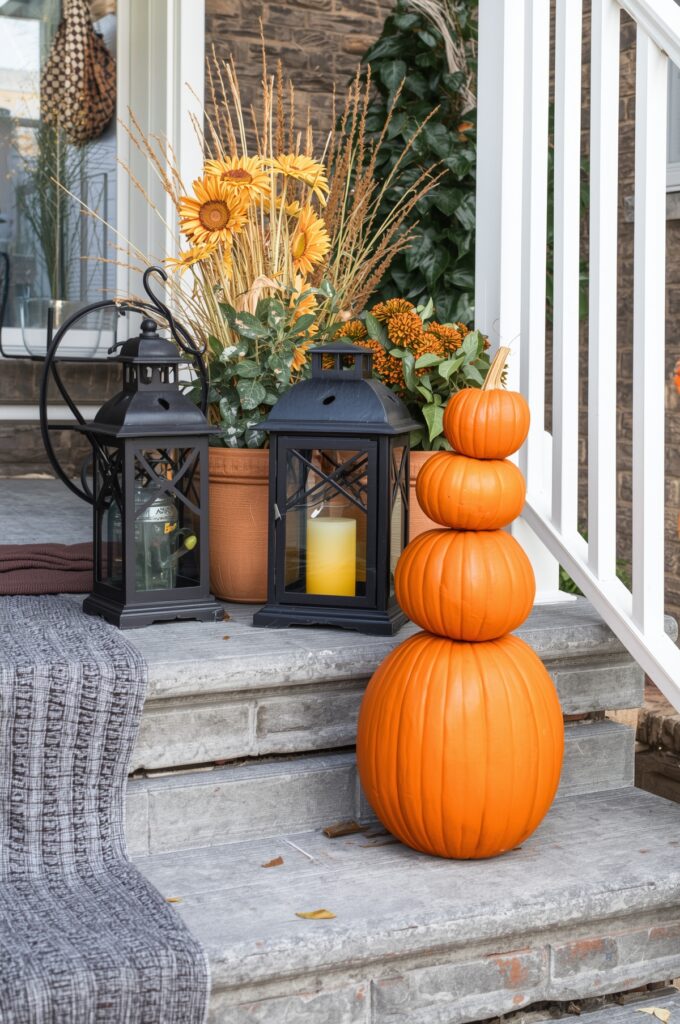 Stack mini pumpkins on your front steps paired with lanterns. This cozy yet spooky display adds warmth and festive charm to your Halloween setup.