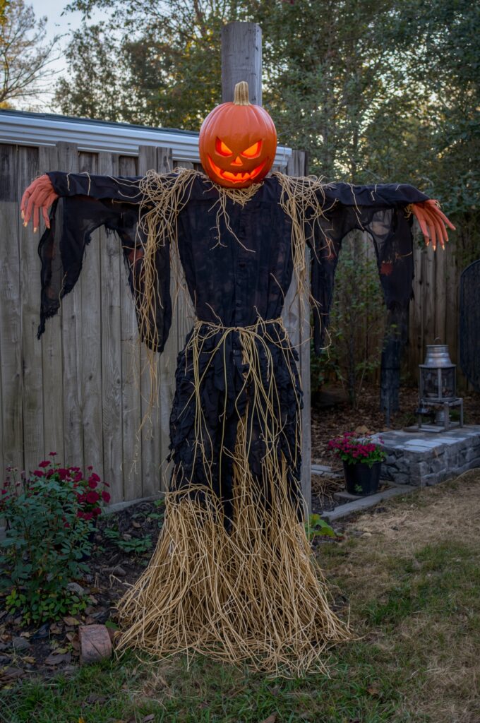 Build a sinister scarecrow using tattered clothes, hay, and a glowing pumpkin head. Place it near your garden or porch to create an eerie guard for your haunted yard.