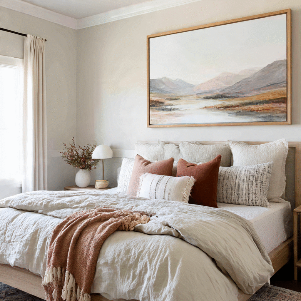 Hotels often feature oversized artwork or minimalist prints. Choose one bold piece or a symmetrical set to add personality.