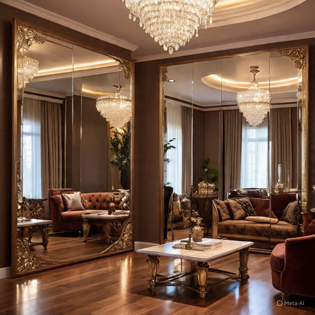 Large, ornate mirrors not only make spaces feel bigger but also enhance glamour by bouncing light around the room.