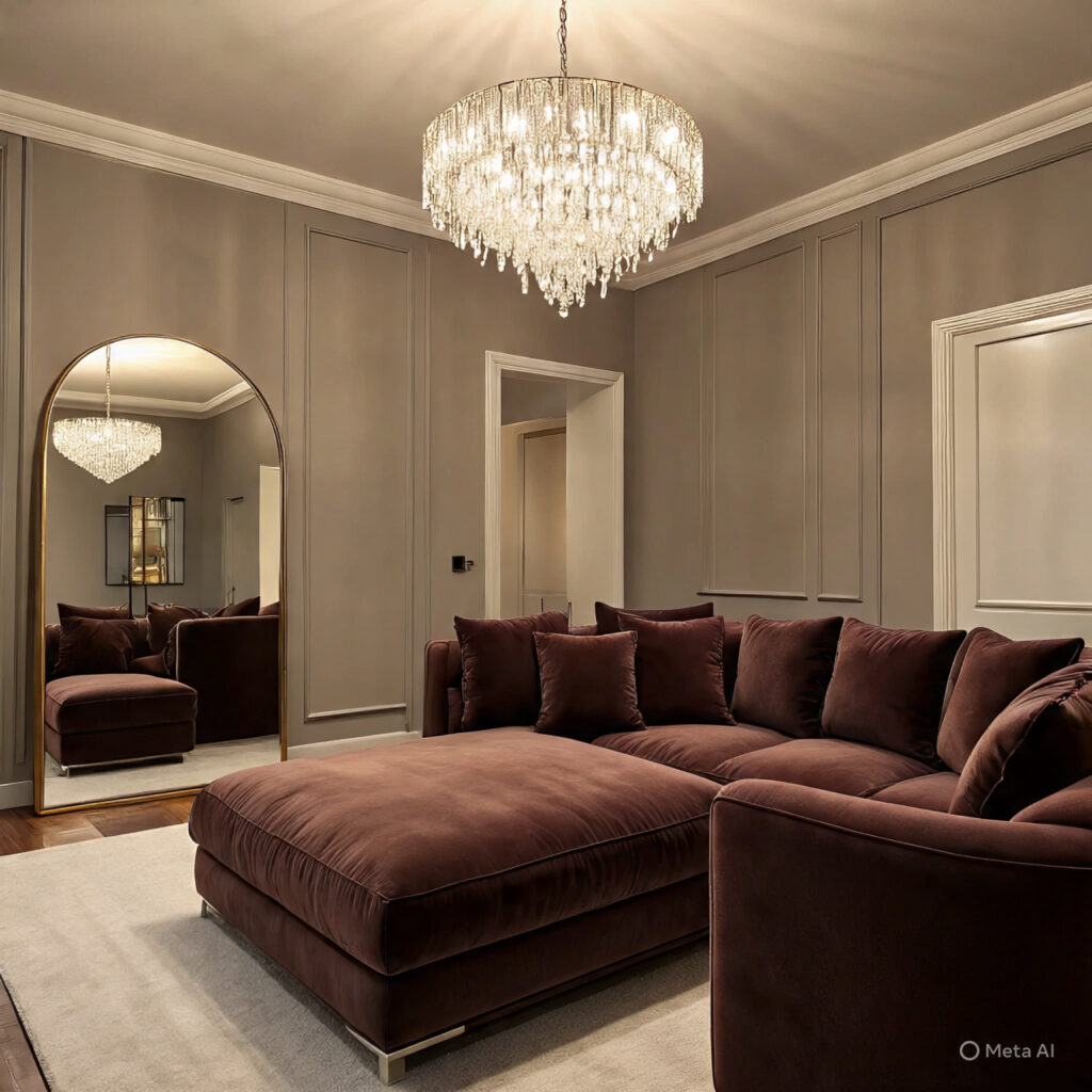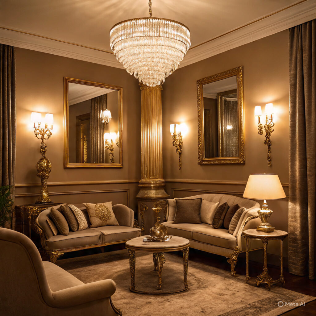 Glamorous interiors thrive on layered lighting. Mix chandeliers, wall sconces, and floor lamps to create a warm, inviting glow.