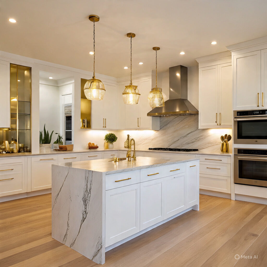 Pair sleek white cabinetry with gold handles, marble countertops, and pendant lighting to bring glamour into your kitchen.