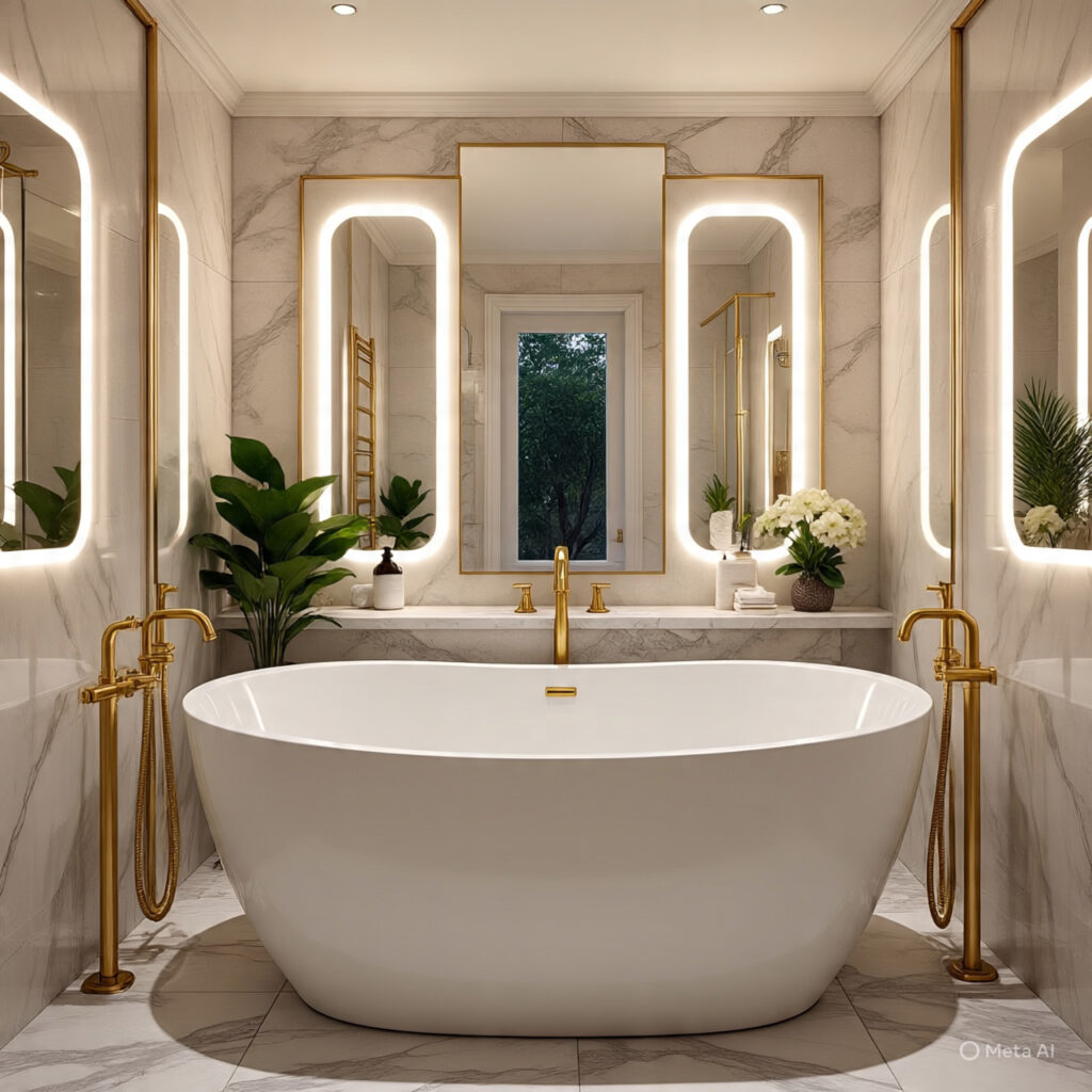 A freestanding tub, gold faucets, and backlit mirrors transform an ordinary bathroom into a glamorous spa-like retreat.