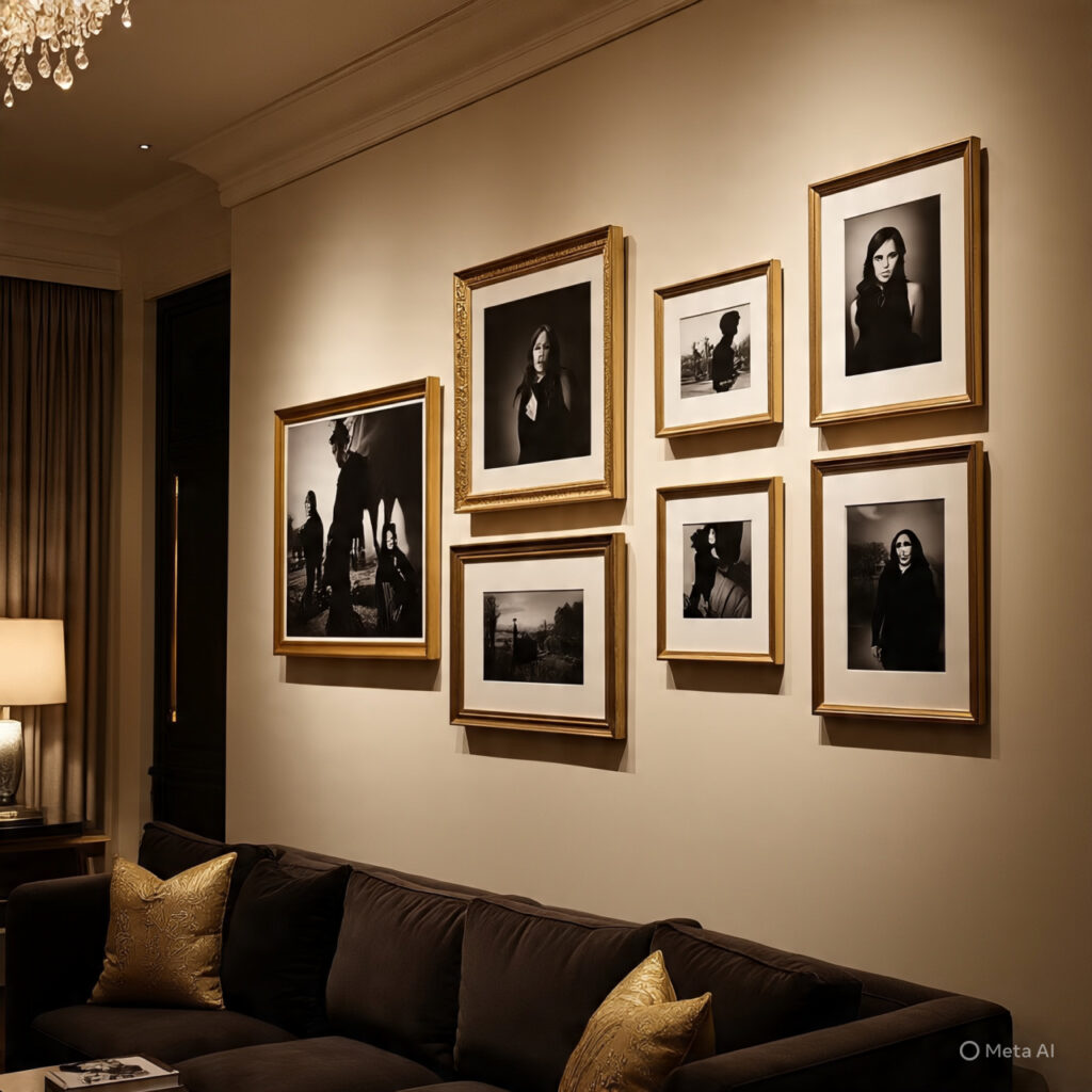Create a glamorous gallery wall with gold frames, black-and-white photography, or art prints. This adds a curated and stylish touch.