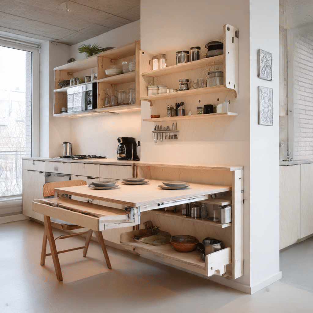 For small apartments, smart layouts with foldable tables and vertical storage can make even the tiniest kitchen shine.