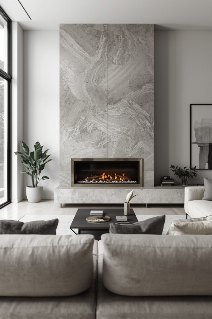 Sleek, contemporary fireplaces with stone, glass, or metal finishes.