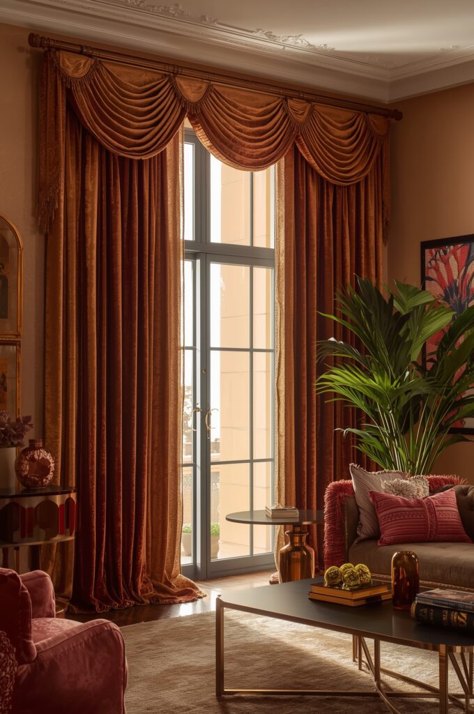 Heavy, luxurious curtains in silk, velvet, or layered textures.