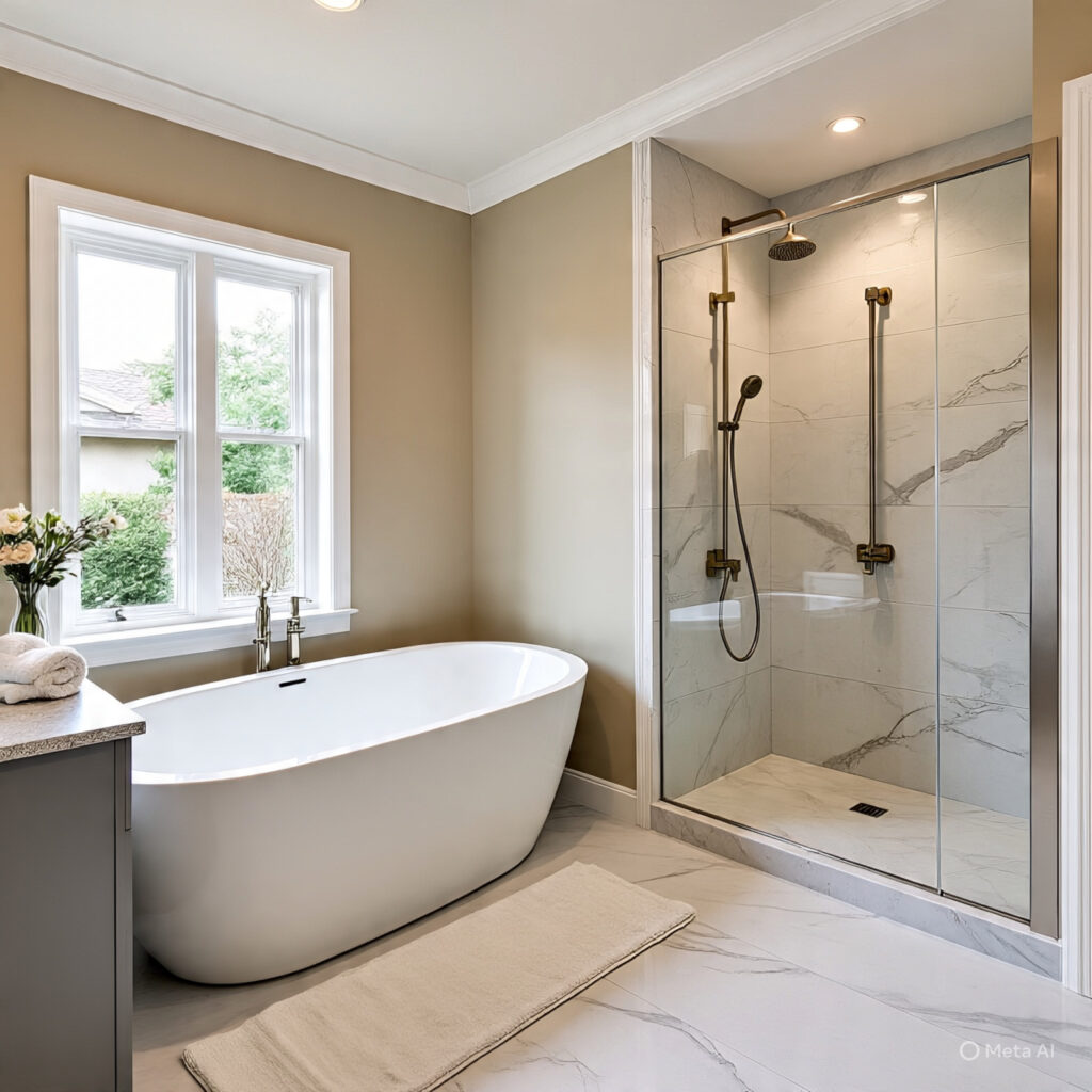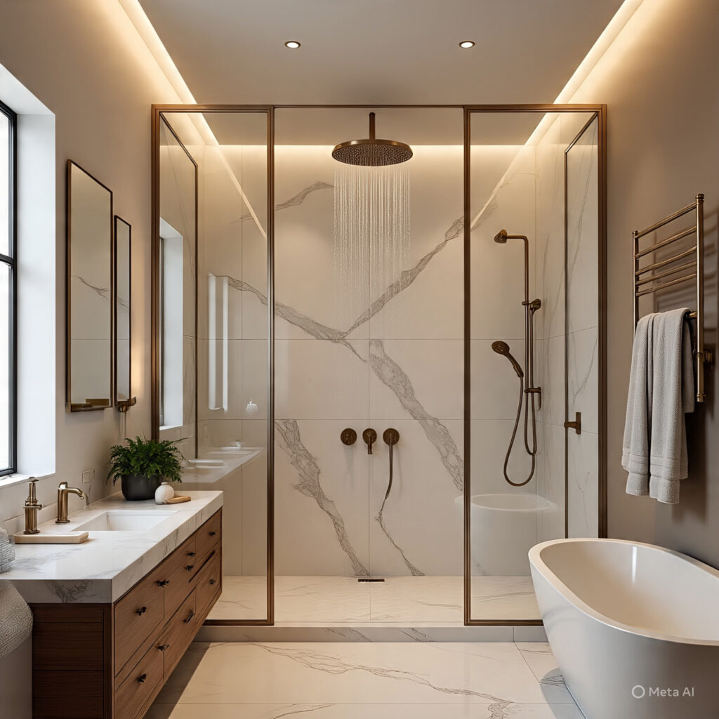 A spacious walk-in shower with frameless glass enclosures offers openness and modern appeal. Add rainfall showerheads, body jets, and steam features for a true spa experience.