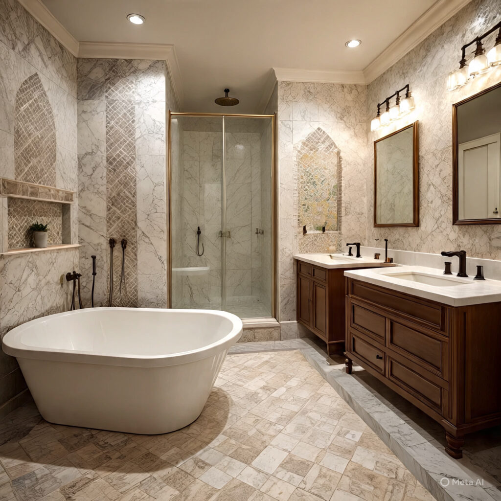 Mosaic, herringbone, or geometric tiles in materials like marble and glass can instantly upscale your bathroom while adding artistry.