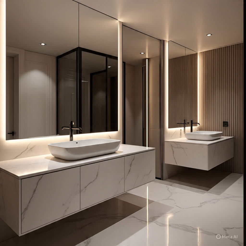 Floating vanities create a sleek, modern look. Paired with under-cabinet lighting, they bring sophistication while saving space.