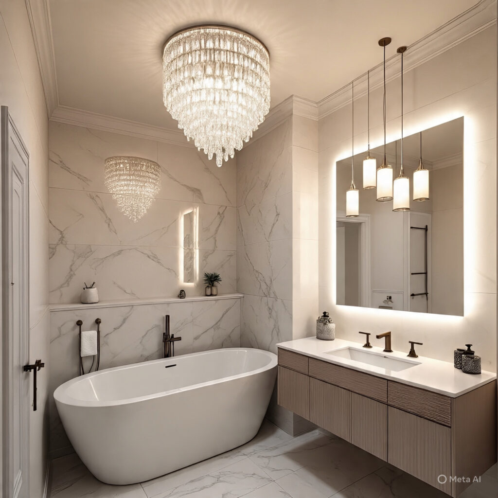 Chandeliers and pendant lighting bring opulence into the bathroom. They add personality while providing ample illumination, especially when paired with backlit mirrors.