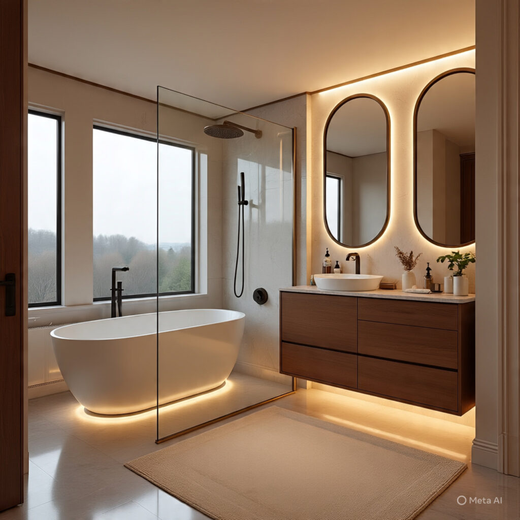 Integrating smart tech like voice-controlled lighting, touchless faucets, or digital shower controls creates a futuristic and convenient high-end bathroom.