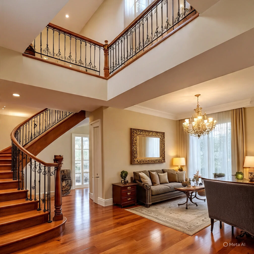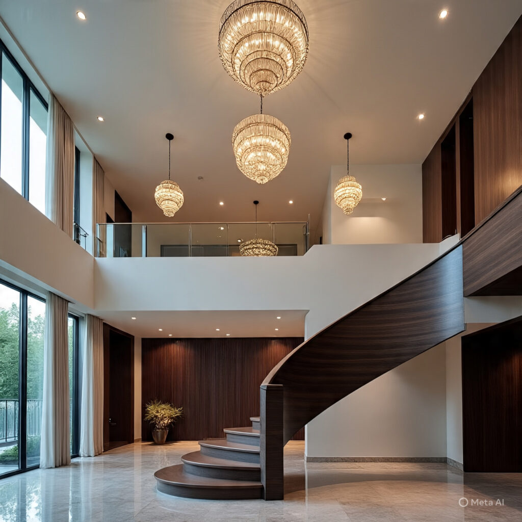 A double-height ceiling paired with a floating staircase creates a dramatic entrance. With chandeliers or pendant lights cascading above, the space exudes grandeur and modern elegance.
