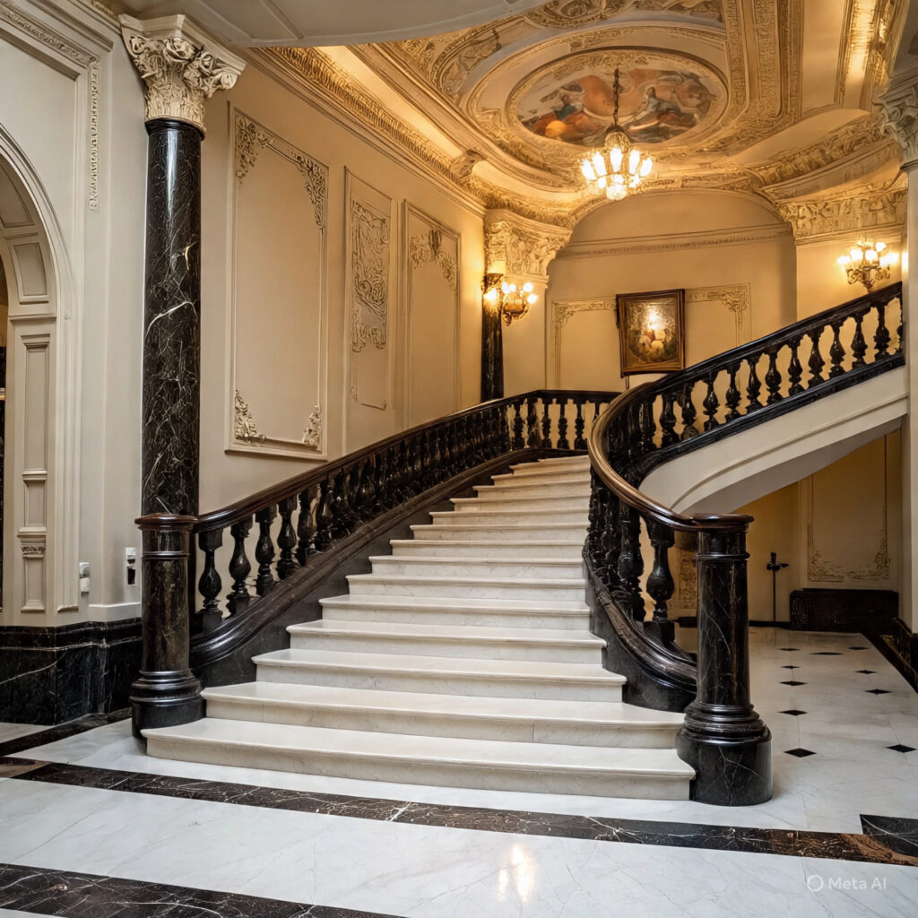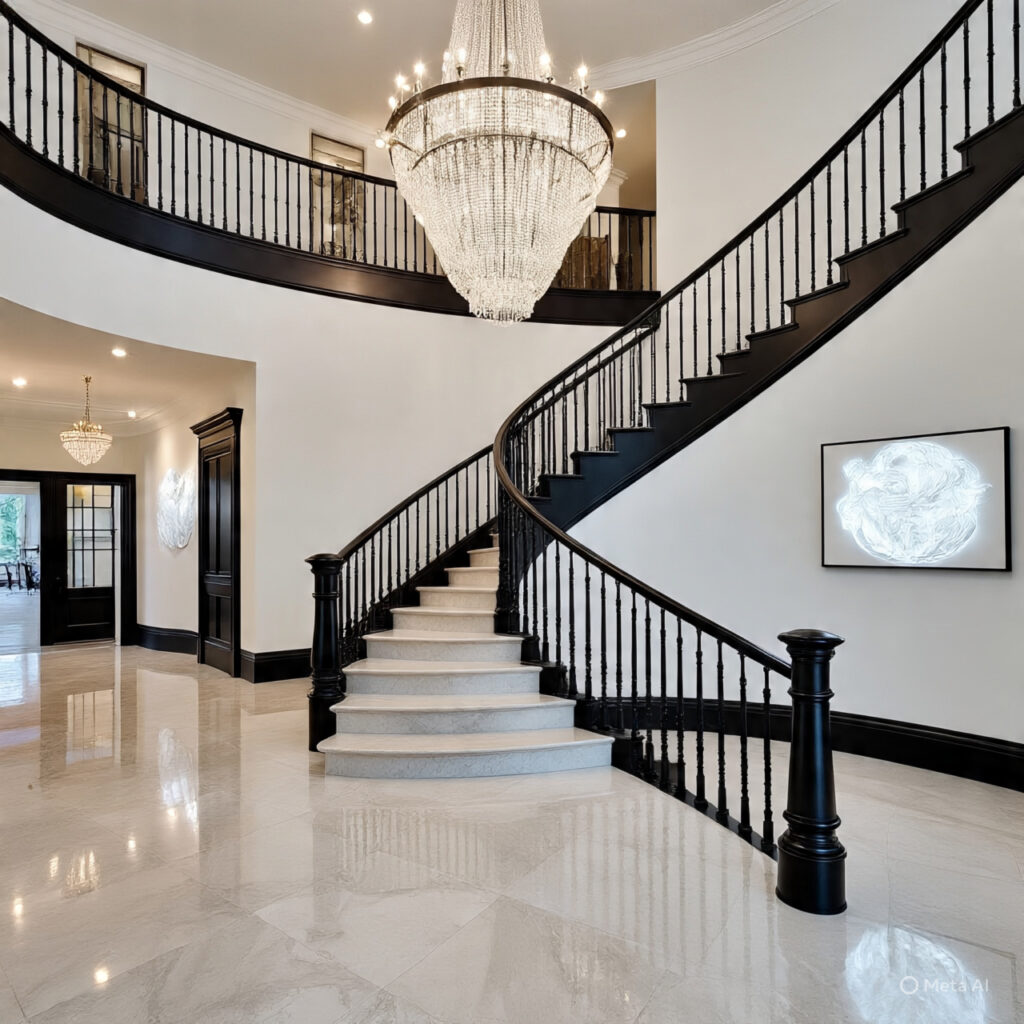 A staircase designed in black metal or stone against white walls creates bold contrast and timeless elegance, making the foyer feel both modern and luxurious.