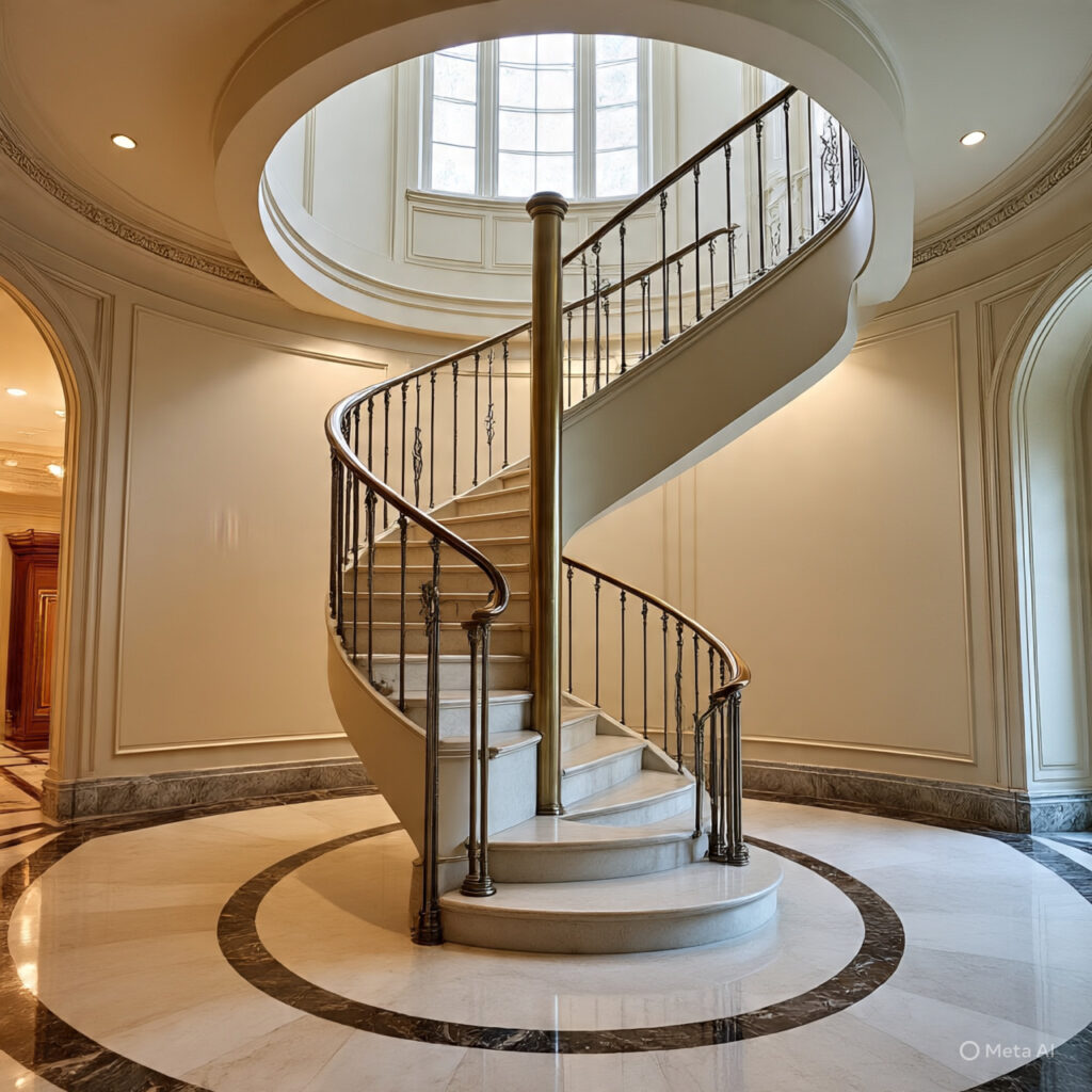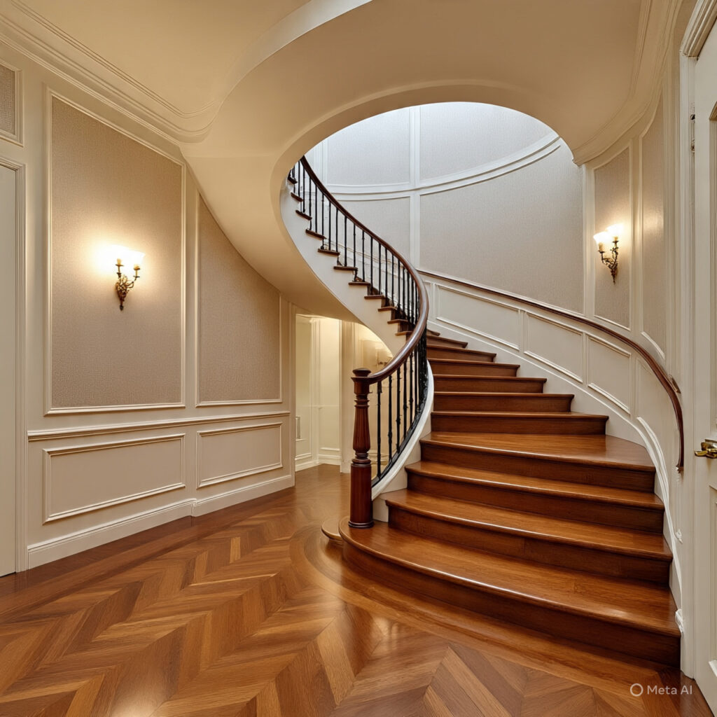 Curved staircases bring fluidity and grace into a foyer. When paired with neutral tones, sleek wood, or metal finishes, the design feels chic yet inviting.