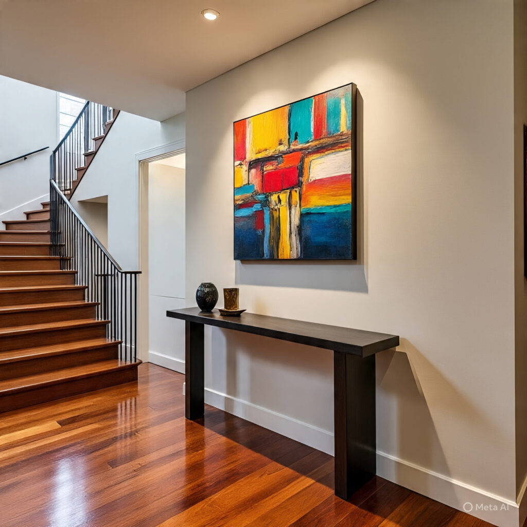 Pairing a staircase with oversized artwork or sculptural wall décor transforms a functional hallway into a gallery-like space that impresses guests.