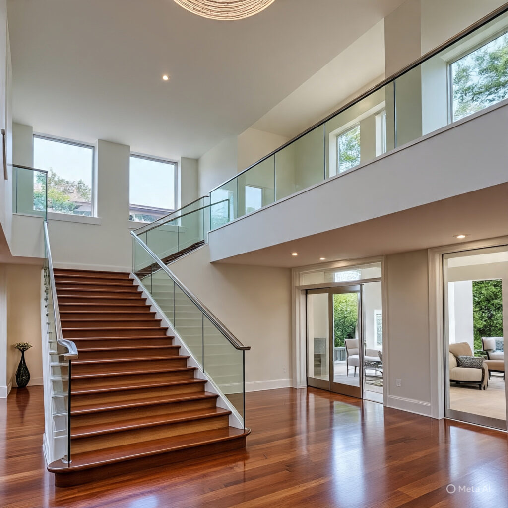 Replacing traditional rails with sleek glass balustrades enhances the foyer’s openness while adding a polished, contemporary vibe.