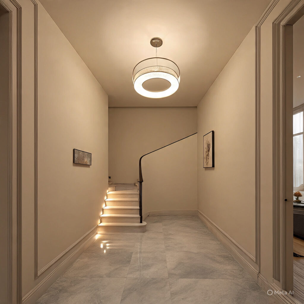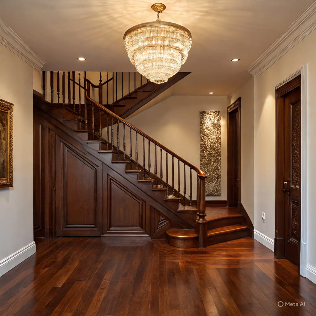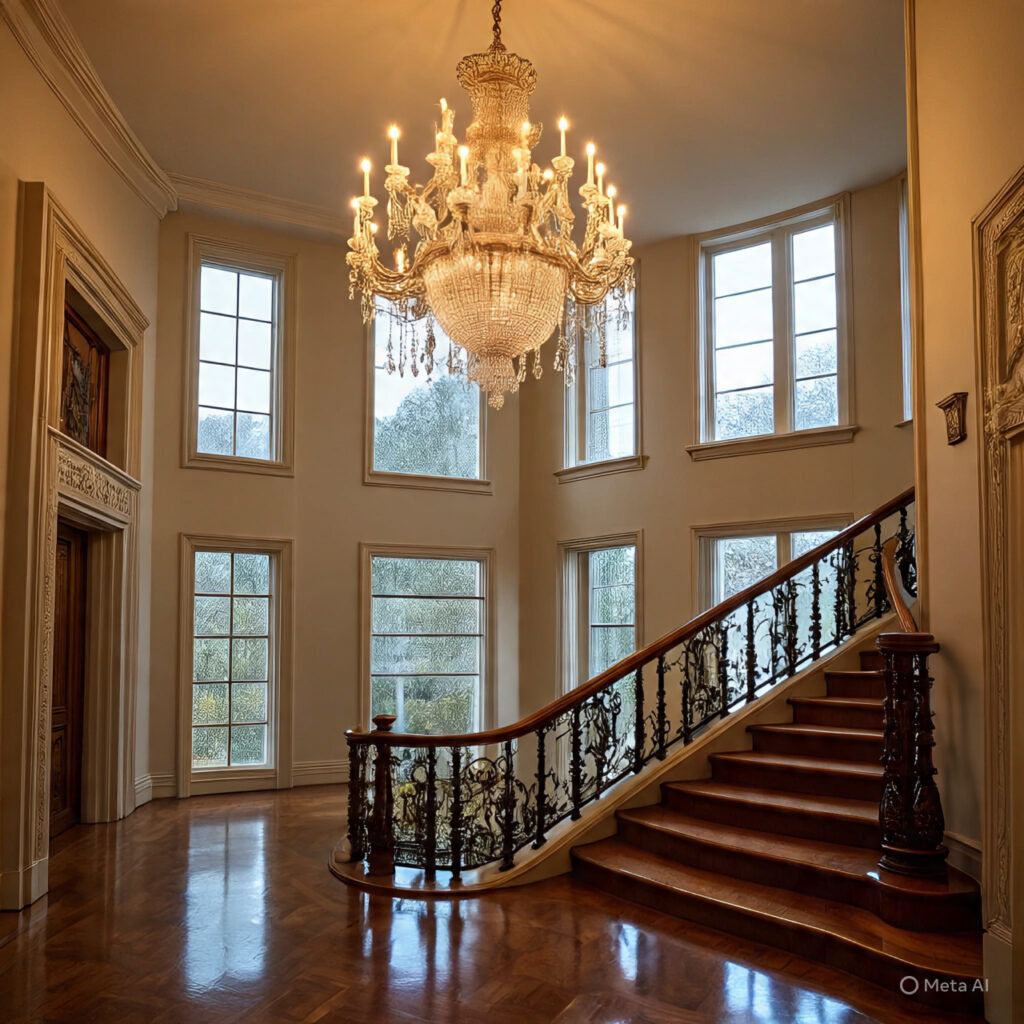 Luxury entrance hallways are incomplete without lighting. A cascading chandelier above a staircase instantly elevates the foyer’s opulence.