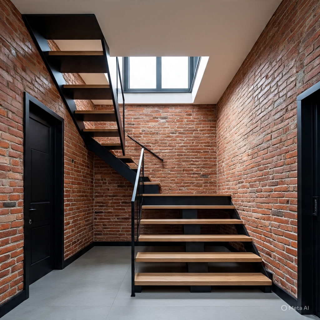 Pairing exposed brick foyer walls with black steel staircases creates a bold industrial-luxury aesthetic, perfect for contemporary homes.
