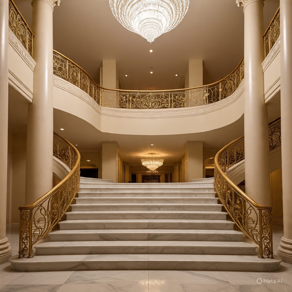 For ultimate sophistication, staircases with marble steps framed by gold handrails create a dramatic and glamorous foyer design.