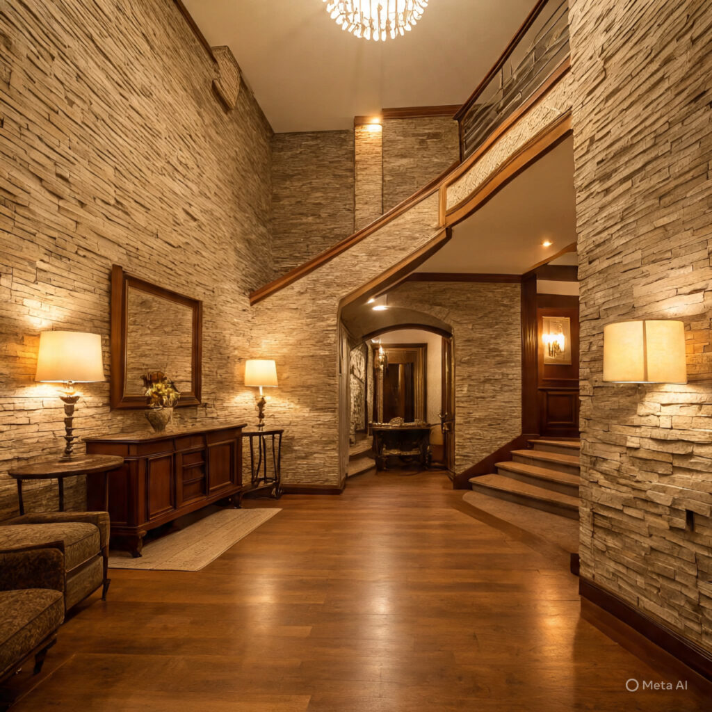 Luxury foyers with textured stone-clad walls beside the staircase add depth and elegance, especially when paired with warm lighting.