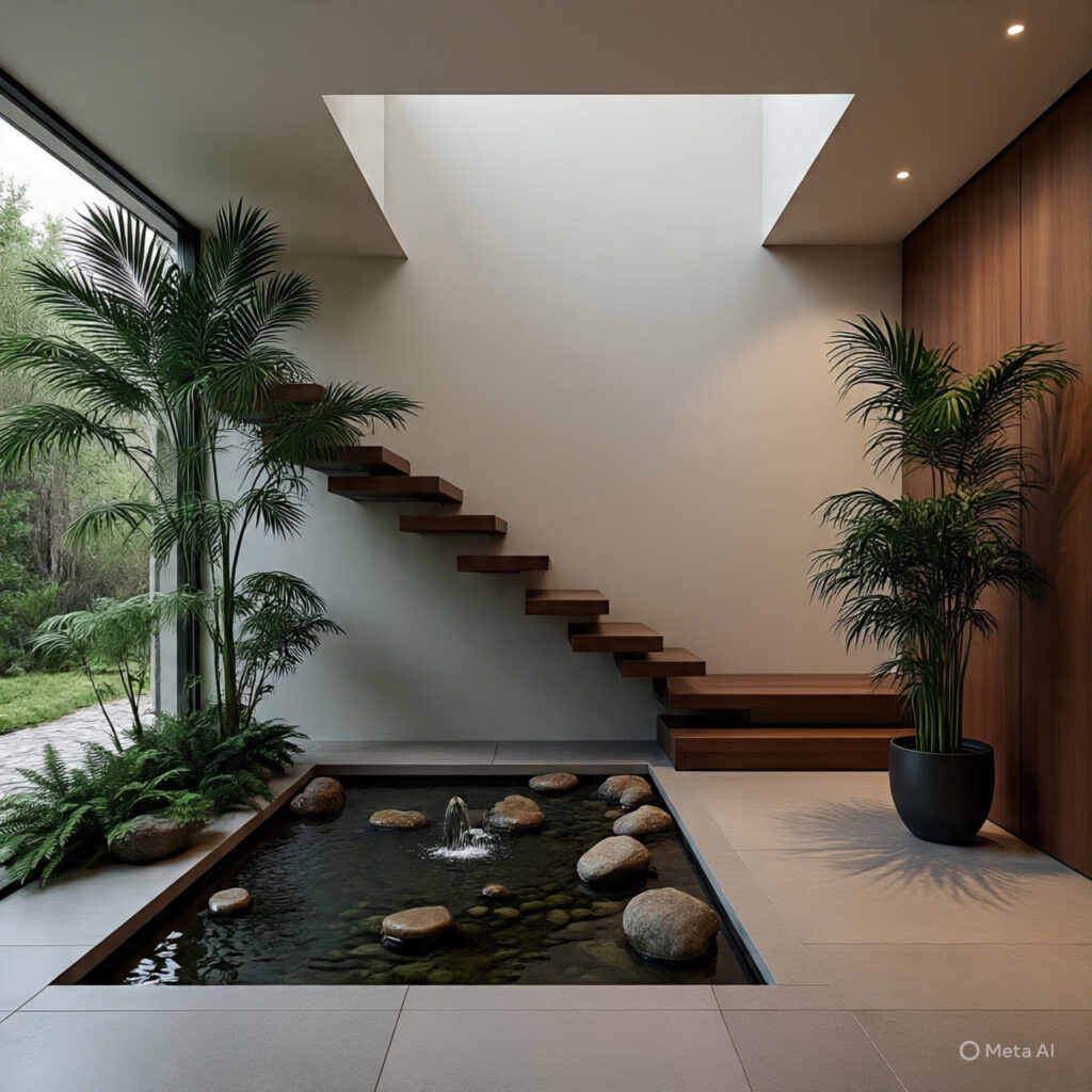 Incorporating natural elements like water features or indoor plants alongside modern staircases brings tranquility and luxury together.