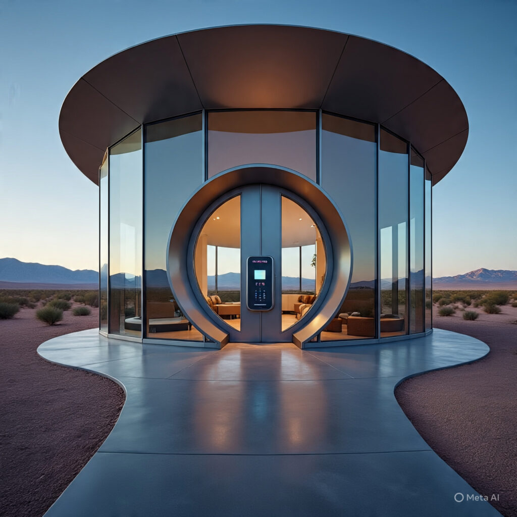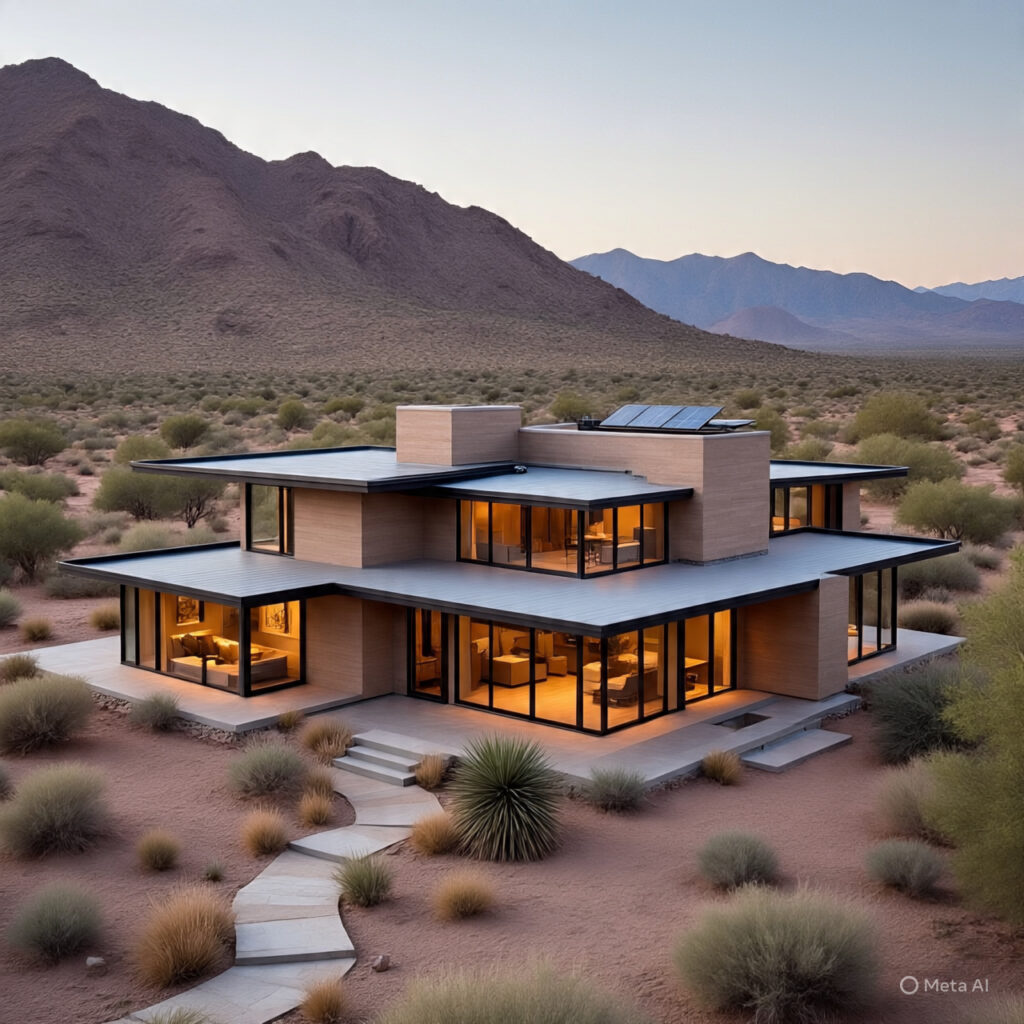 Designed for an arid climate, this home features natural cooling systems, solar-paneled roofs, and seamless integration with the desert landscape, creating a modern contrast.