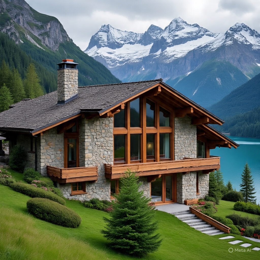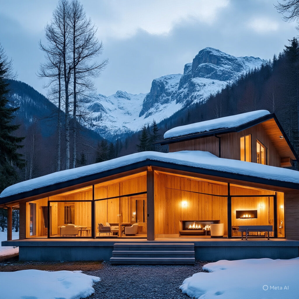 Built into the mountains, this mansion uses natural stone walls, advanced thermal insulation, and geothermal energy, ensuring both comfort and sustainability.
