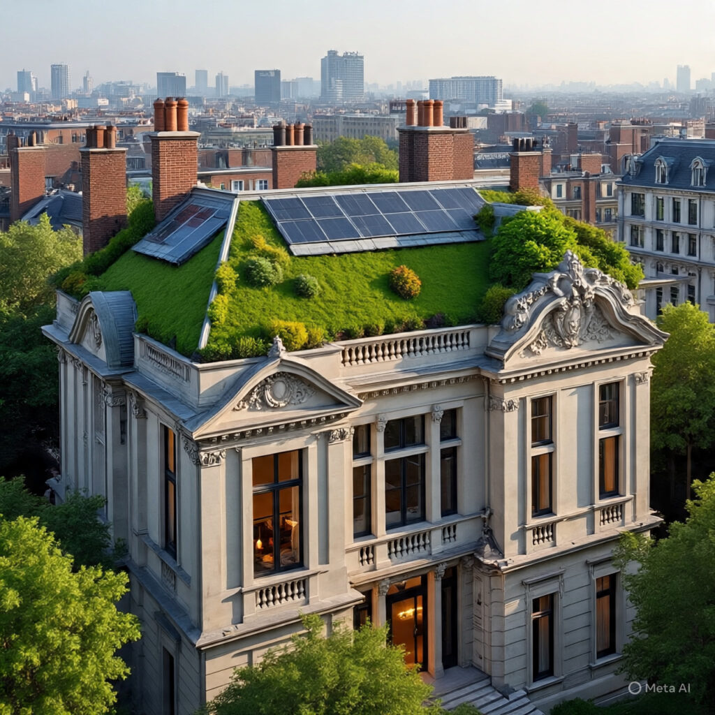 Sustainability meets urban sophistication in this mansion, which includes a fully vegetated green roof, solar panels, and breathtaking skyline views.