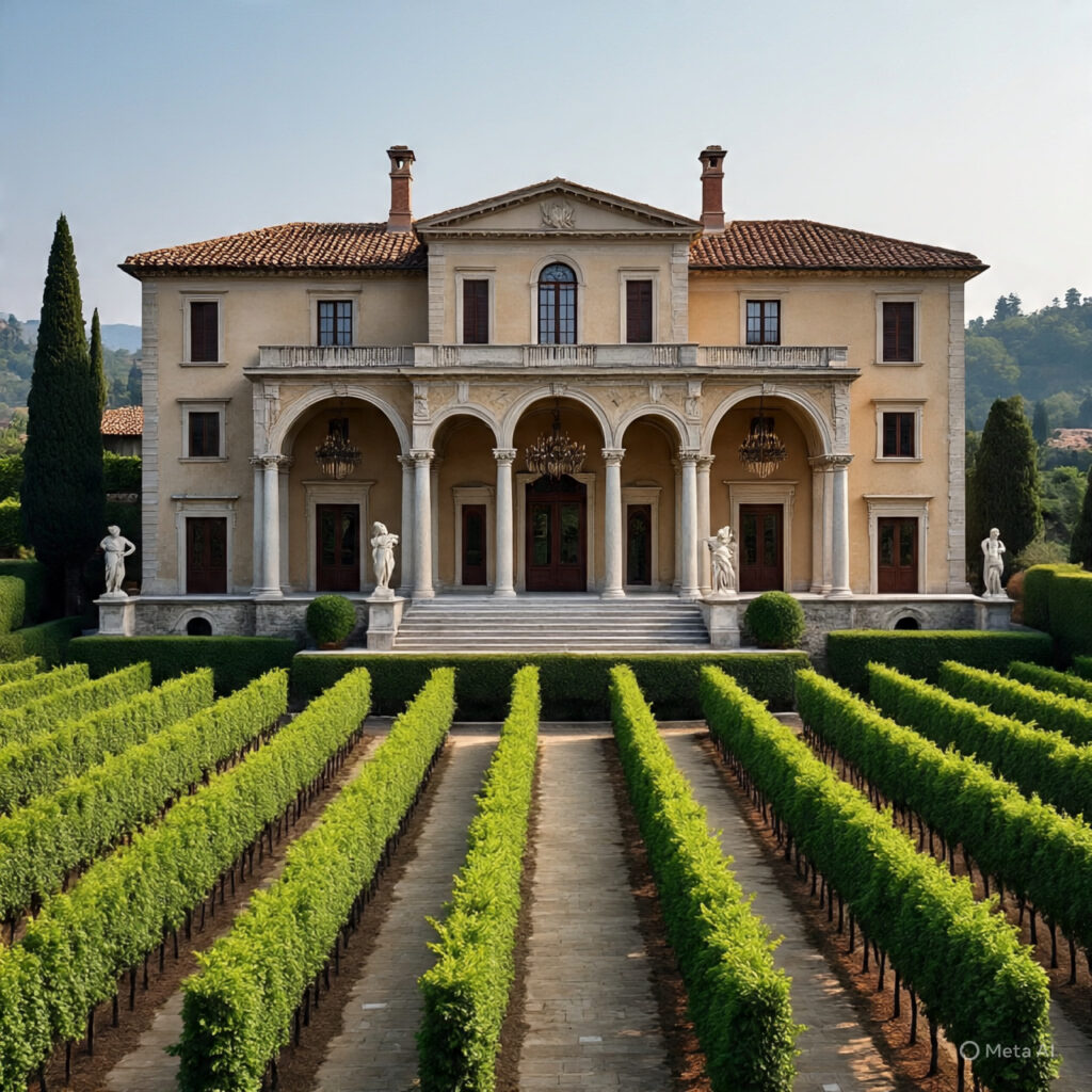 Inspired by Renaissance villas, this mansion blends tradition and modernity with private vineyards, classical sculptures, and lavish interiors.